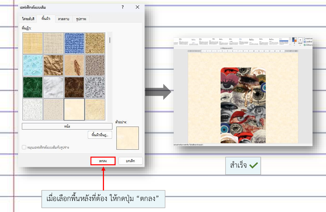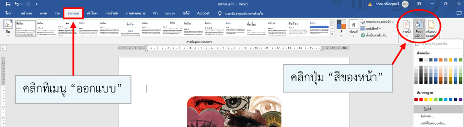 การจัดรูปแบบเอกสารและข้อความ คลิกที่เมนูออกแบบ หรือคลิกที่สีของหน้า เอาสีพื้นหลังออก ไปที่ ออกแบบ > สีของหน้า เลือก ไม่มีสี