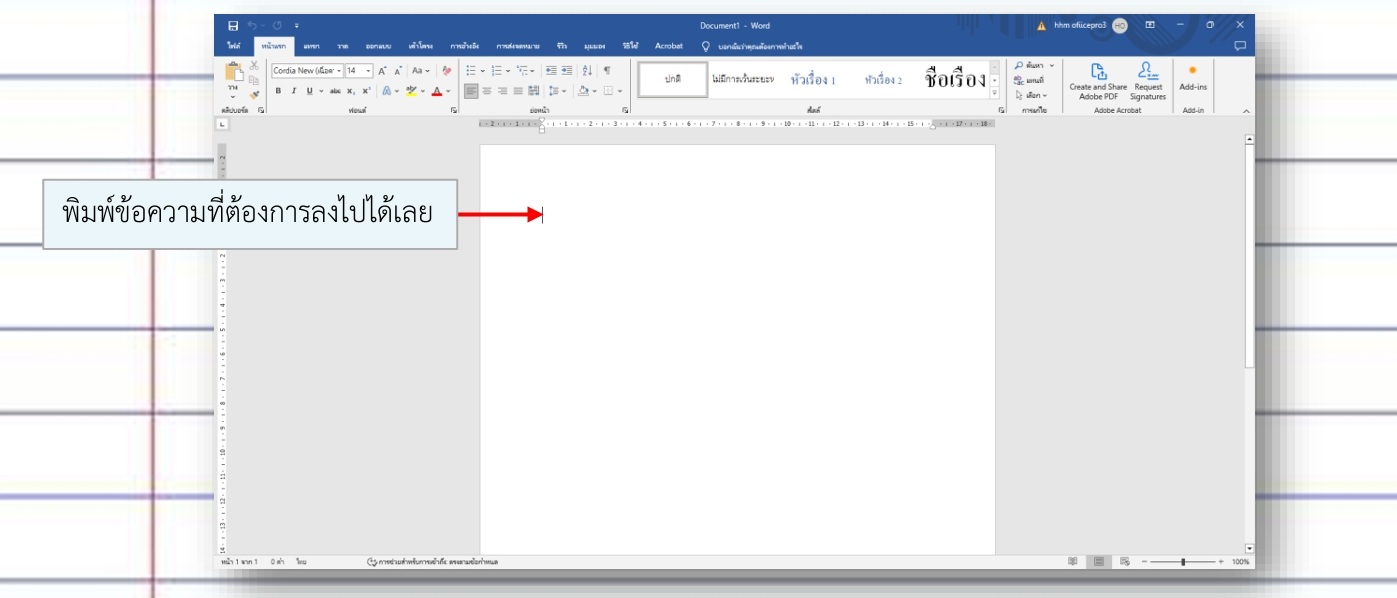 เมื่อเปิดโปรแกรม Microsoft Office Word ขึ้นมาแล้ว ต้องการพิมพ์งานในเอกสาร สามารถทำได้ โดยมีขั้นตอนดังนี้