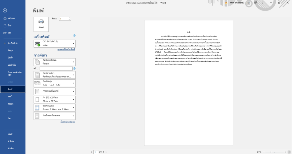 การสั่งพิมพ์เอกสารทำได้โดยเปิดแฟ้มเอกสารที่สร้างไว้ก่อนหน้ำ หรือจากจอภาพ การสร้ำงเอกสารที่กำลังทำงาน คลิกเลือกเมนูคำสั่ง “แฟ้ม” แล้วเลือกคำสั่ง “พิมพ์” จะแสดงตัวเลือกการพิมพ์พร้อมหน้าตัวอย่าง ดังนี้