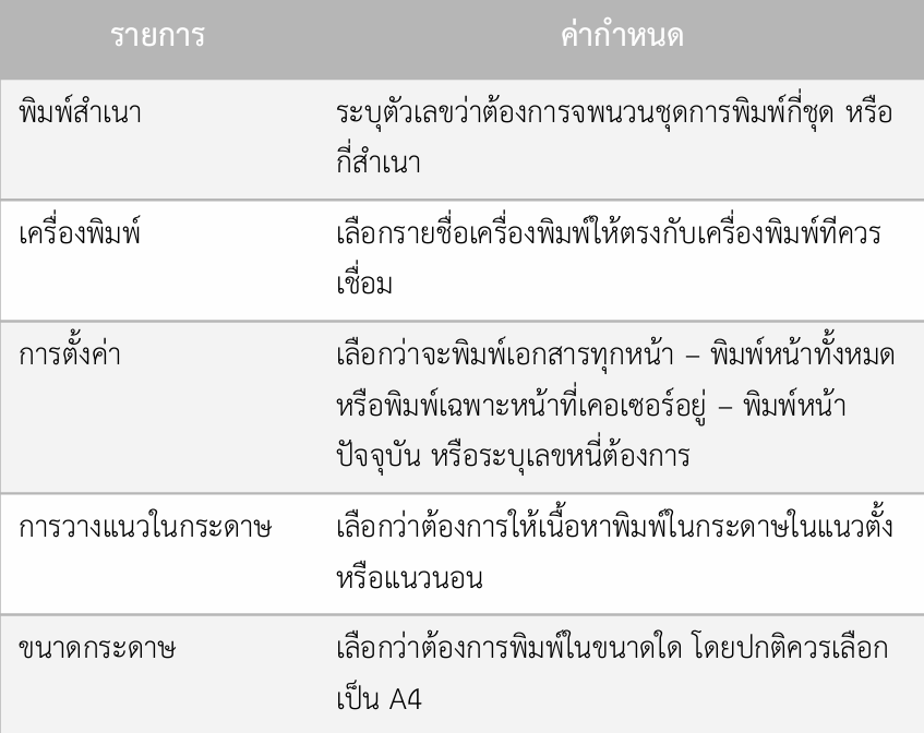 จากจอภาพตัวเลือกการพิมพ์พร้อมหน้าตัวอย่างข้างต้น ควรดำเนินการปรับค่าการพิมพ์ให้เหมาะสมก่อน โดยมีรายการที่ควรทราบ ดังนี้