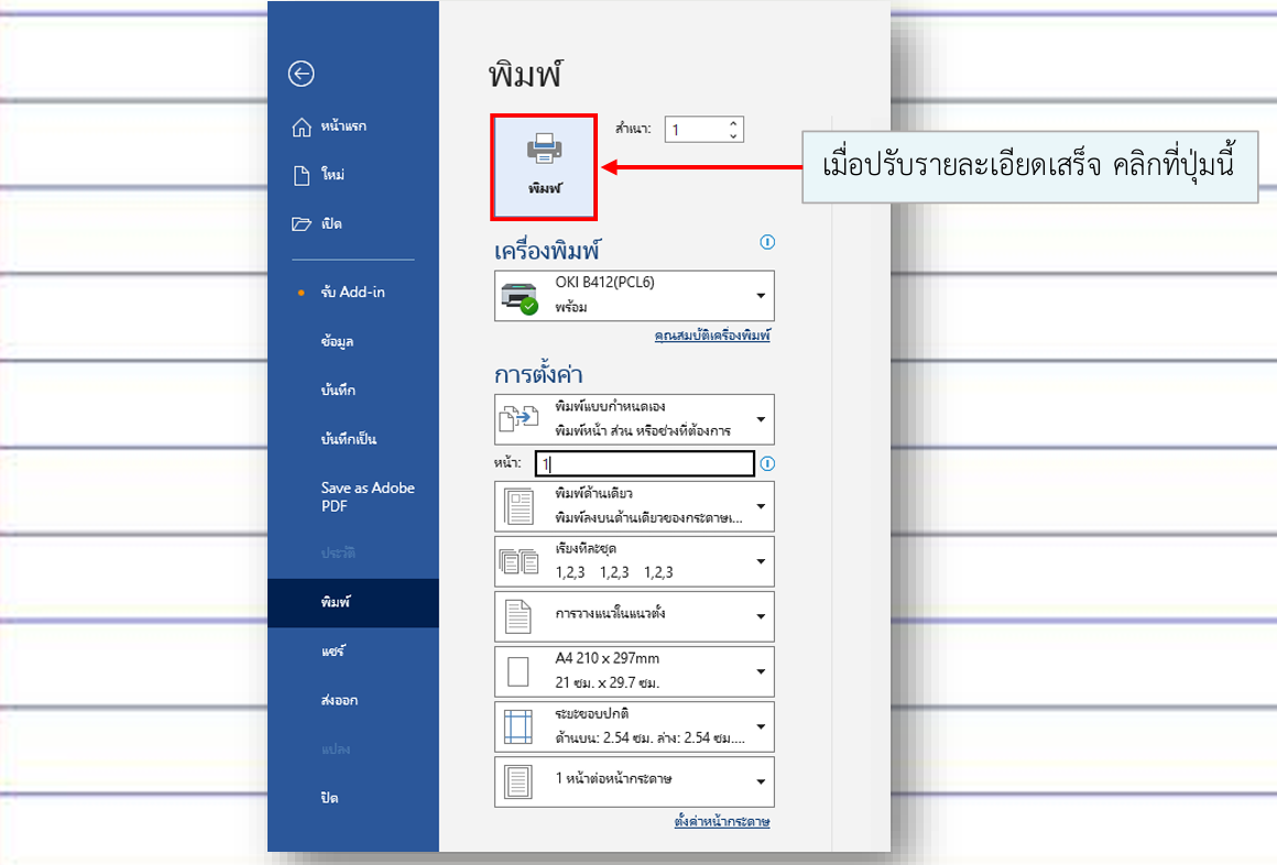 เมื่อกำหนดรายละเอียดการพิมพ์และเชื่อมเครื่องพิมพ์กับคอมพิวเตอร์แล้วให้คลิกปุ่ม “พิมพ์”